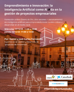 La segunda acción formativa también se centró en la Inteligencia Artificial, bajo el título «Emprendimiento e Innovación: la Inteligencia Artificial como Aliada en la gestión de proyectos empresariales» que se realizó el 17 y 18 de diciembre, de forma online y horario de mañana, haciendo hincapié en la innovación que supone la IA para la elaboración de memorias de proyectos y planes de viabilidad empresariales. Se utilizó la plataforma Zoom y en las 5hs. (2 sesiones de 2,5 hs) los ponentes -los hermanos Daniel y José Carlos Fernández- explicaron utilidades prácticas que usan inteligencia artificial facilitando algunas tareas de los/as emprendedores/as rurales o ayudándoles a desarrollar nuevas ideas en el medio rural como en el desarrollo de planes de negocio, memorias, búsqueda de financiación, etc. a través de herramientas como Notebook o chat GPT.